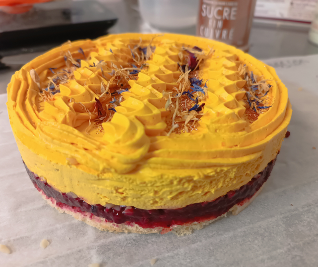 PK45 Mangue et fruits rouges : un entremet à base de farine de manioc et de souchet; un insert au fruits rouges; une mousse de mangue sans lactose.