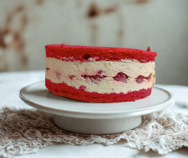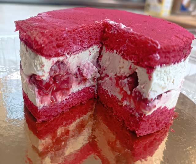 Framboisier revisité. Un biscuit génoise à la farine de manioc et de souchet sans gluten. Une crème diplomate sans lactose avec ses framboises entières et sans lactose. 10% de sucre.